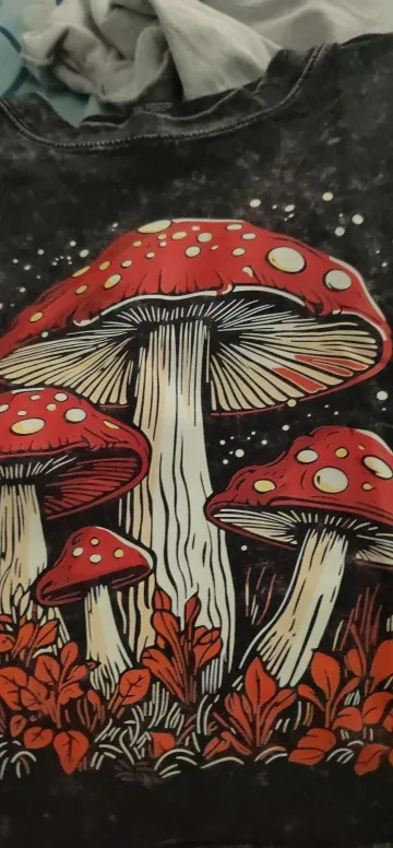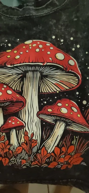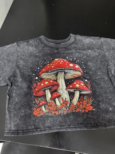 The super-short length and regular sleeves create a laid-back vibe, while the unique cartoon mushroom pattern adds a touch of whimsy. Rock this top with your favorite high-waisted jeans or a flowy skirt for a look that's both retro and modern.